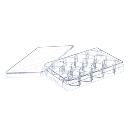- 12 jamek, plocha 3,9 cm2, vstupní materiál PS, povrch TC, celkový objem jamky 6,5 ml, pracovní objem jamky 2-4 ml.